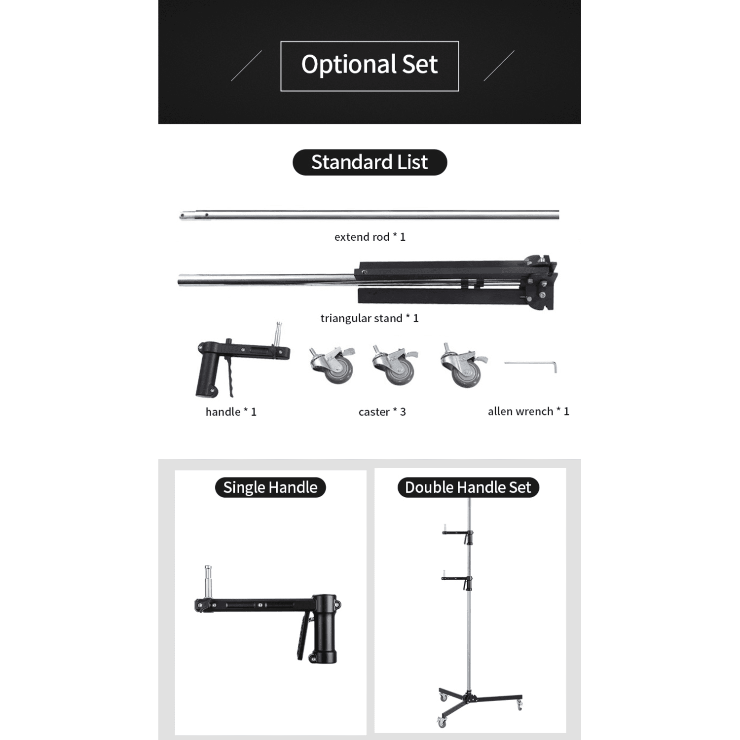 უმაღლესი ხარისხის მეტალისგან დამზადებული, ძალიან მყარი, მძლავრი უნივერსალური სადგამი გორგოლაჭებით, მძიმე სამუშაოებისთვის. სპეციალური სახელურის მეშვეობით სტენდზე ერთდროულად შესაძლებელია რამოდენიმე განათების/კამერის/მონიტორის და სხვა ნებისმიერი ნივთის დამაგრება. 360 გრადუსიანი სახელურის საშუალებით შესაძლებელია სიმაღლის და მიმართულების რეგულირება.