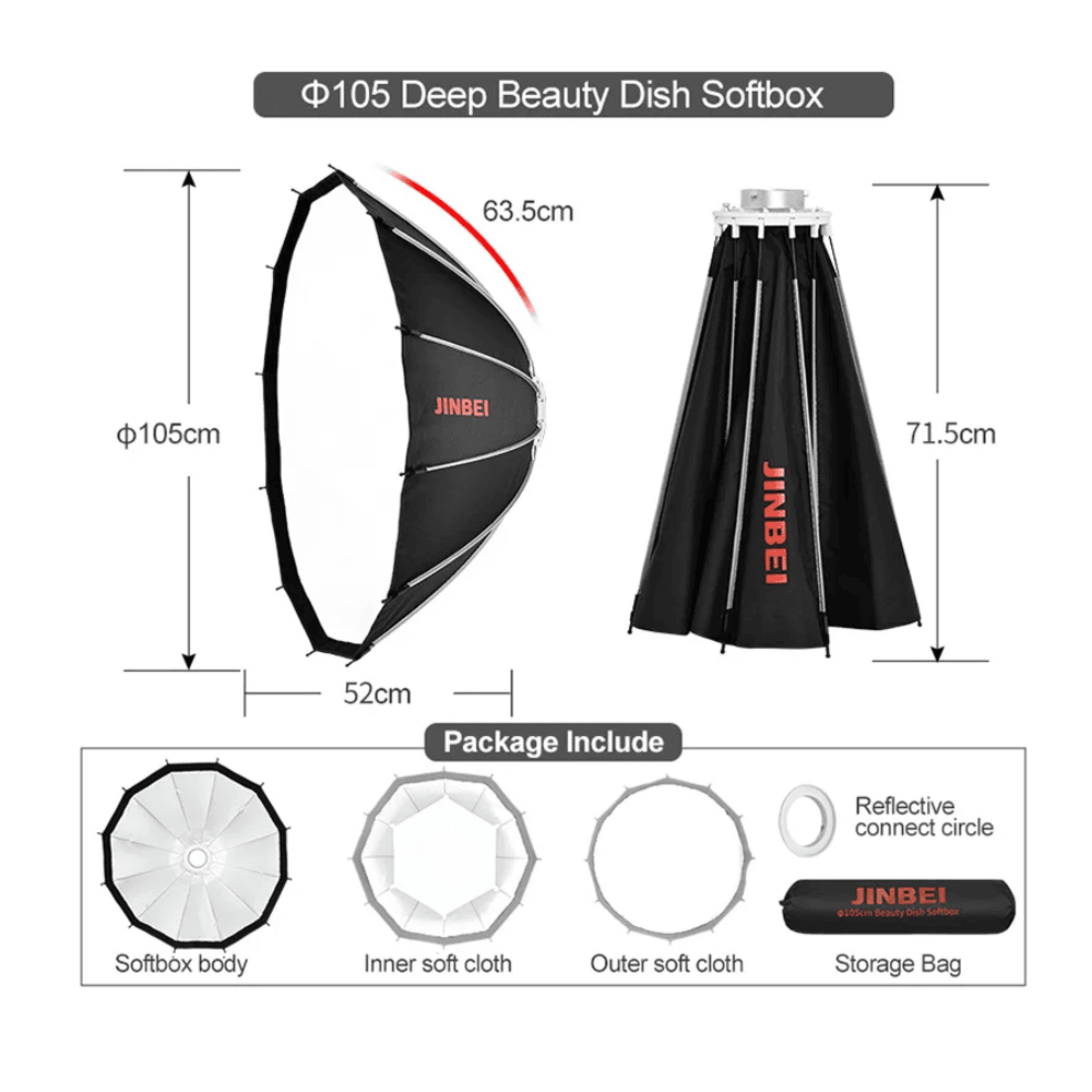 Jinbei 65/85/105 Quick Open deep beauty dish softbox with high quality easy opening system for photo-video lights on Bowens mount. With 2 diffusers and the ability to attach a grid (the grid is not included in the standard set).