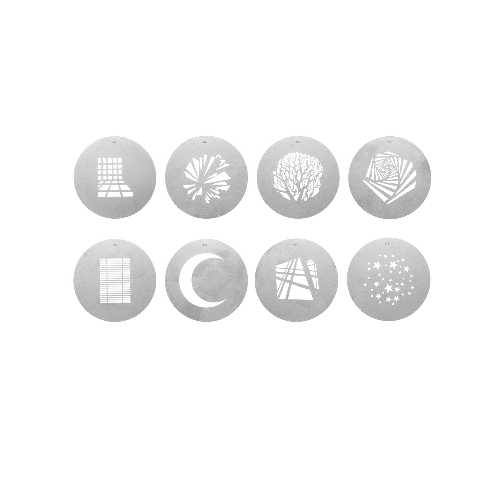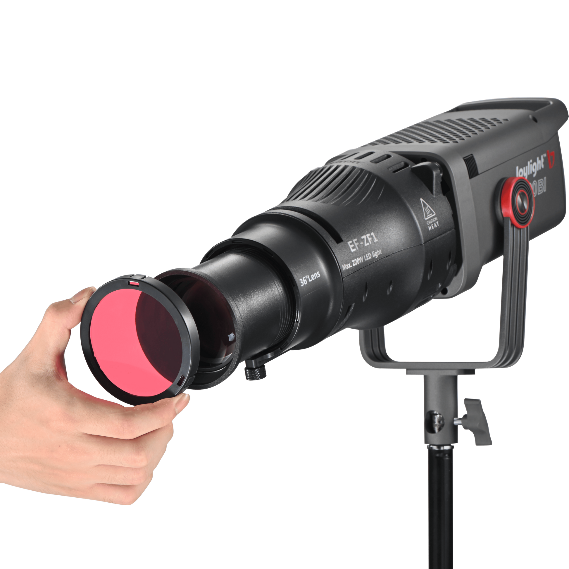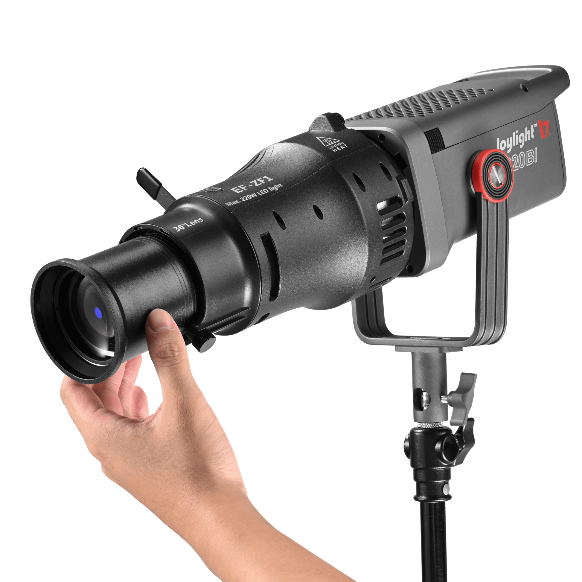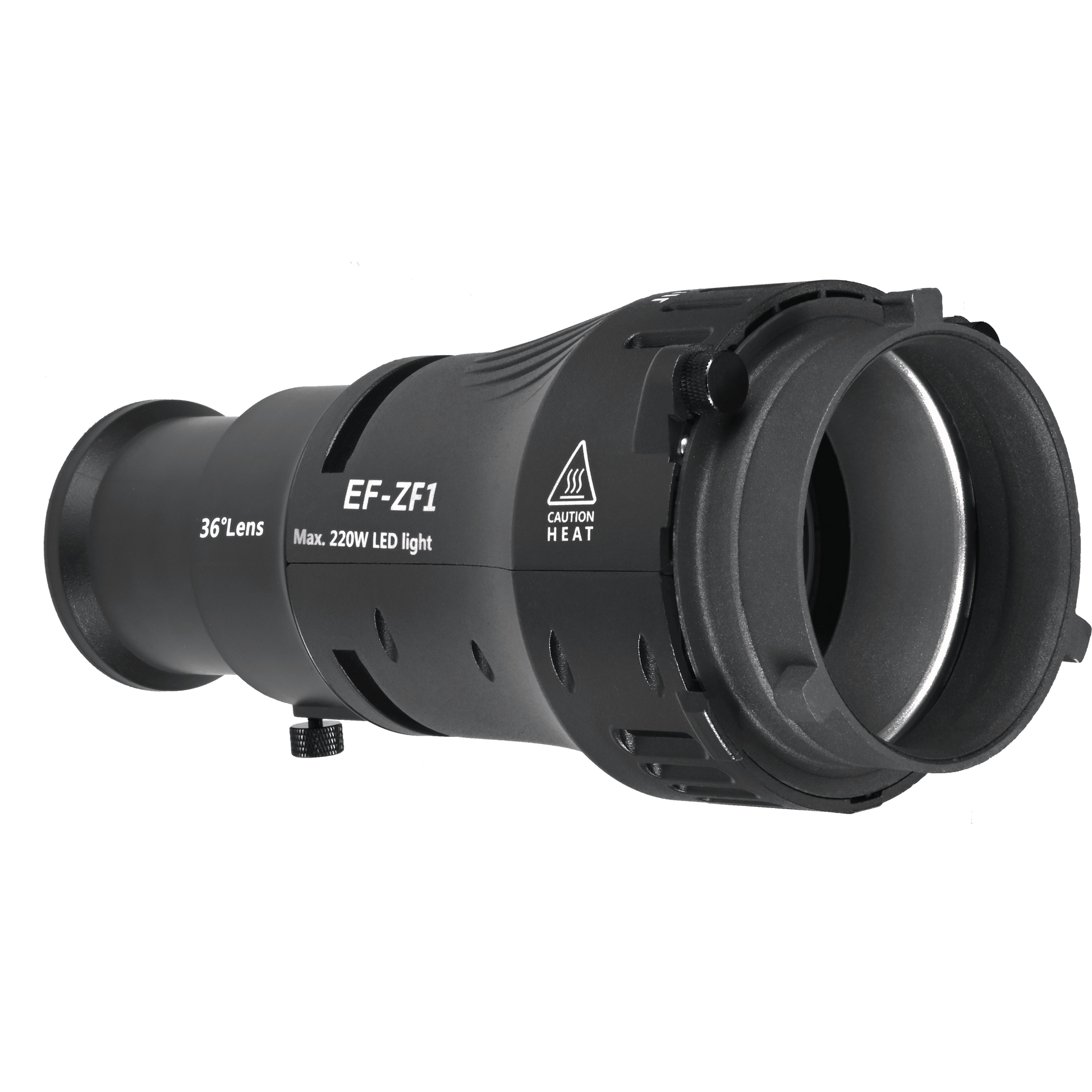 Jinbei EF-ZF1 optical spot attachment for LED lights with 36° lens and 8pcs Gobos. Through the lens you can get up to 1.2x light output and special effects.